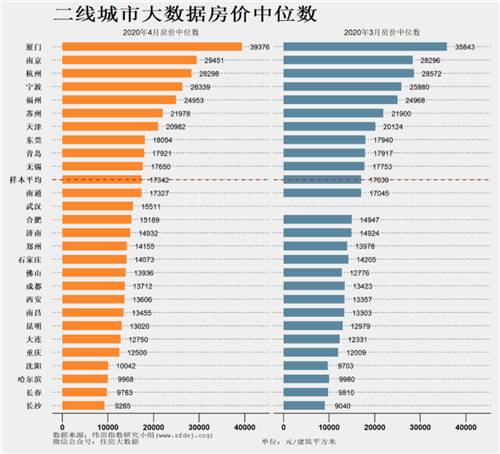 二線城市房價中位數(shù)的平均值為17342元/建筑平方米,比上月漲跌303元/建筑平方米。