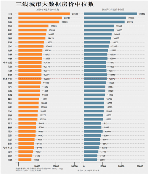 三線城市房價中位數(shù)的平均值為12282元/建筑平方米,比上月漲跌10元/建筑平方米。