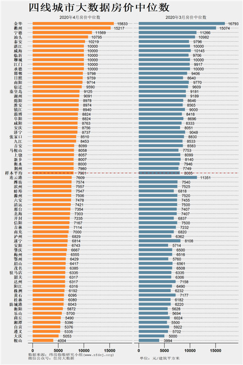 房訊網(wǎng)訊 近日,緯房指數(shù)研究小組發(fā)布了2020年04月重要城市大數(shù)據(jù)房價中位數(shù)(以2020年04月末為基準(zhǔn))。大數(shù)據(jù)房價中位數(shù)顯示,與上月相比,四線城市房價中位數(shù)總體下行,一線二線三線城市總體上行。