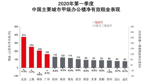 二線城市普遍面臨的市場(chǎng)壓力也較為明顯,尤其是市場(chǎng)剛剛經(jīng)歷了2019年經(jīng)濟(jì)不確定性所帶來的種種變化。本季度由于武漢的租賃活動(dòng)基本停滯,市場(chǎng)租金無變化外,在仲量聯(lián)行跟蹤的其他1.5線及二線城市中,所有城市均錄得一定程度上的租金下跌。