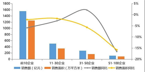 各陣營房企銷售及同比來看,今年前5月,TOP10房企銷售額均值為1558.4億元,同比下降5.9%;TOP11~30房企銷售額均值為502.9億元,同比均值下降2.7%;TOP31~50企業(yè)、TOP51~100房企的銷售額均值分別為274.9億元和115.5億元,其中TOP30~50房企同比均值上升2.1%,TOP51~100房企同比均值下降16.6%。