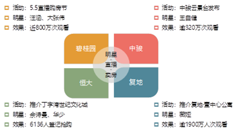 值得注意的是,隨著市場逐步恢復(fù),多個房企開始試水“明星+直播+賣房”的創(chuàng)新營銷模式。如復(fù)地與薇婭跨界合作,首秀獲得逾1900萬人次觀看;中駿在抖音舉行中駿云景臺發(fā)布活動;碧桂園在5·5直播購房節(jié)中進(jìn)行多城市項目覆蓋宣傳,疊加較大的優(yōu)惠力度,實現(xiàn)800萬次觀看。