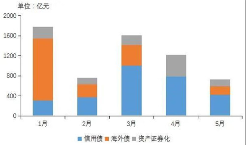 但累計數(shù)據(jù)仍然同比普遍下滑:1~5月份房企海外債、信用債以及資產(chǎn)證券化融資總額為6104.4億元,同比下滑7.8%。其中,海外債融資2068.9億元,同比下滑5.8%;信用債融資2893.6億元,同比增5.1%;資產(chǎn)證券化發(fā)行1141.9億,同比下滑31.6%。