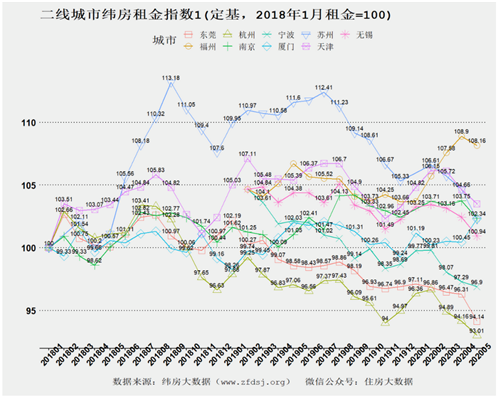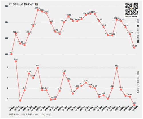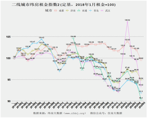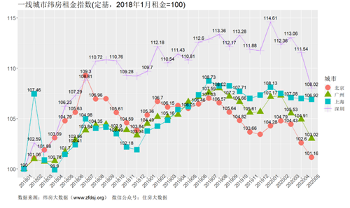 6月16日,緯房大數(shù)據(jù)公布了2020年5月緯房租金指數(shù)(以5月底住房租金為基準(zhǔn))。除廈門(mén)外,一二線城市5月租金均出現(xiàn)下降。下跌的一二線城市中,除武漢外,南通、深圳租金下跌速度居前。外來(lái)人口比重較大的城市,往往也是租金下跌較快的城市。