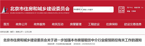 房訊網(wǎng)訊 6月15日,北京市住建委發(fā)布《關(guān)于進(jìn)一步加強(qiáng)本市房屋租賃中介行業(yè)疫情防控有關(guān)工作的通知》。