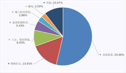 2019年,全國房屋市政工程生產(chǎn)安全事故按照類型劃分,高處墜落事故415起,占總數(shù)的53.69%;物體打擊事故123起,占總數(shù)的15.91%;土方、基坑坍塌事故69起,占總數(shù)的8.93%;起重機(jī)械傷害事故42起,占總數(shù)的5.43%;施工機(jī)具傷害事故23起,占總數(shù)的2.98%;觸電事故20起,占總數(shù)的2.59%;其他類型事故81起,占總數(shù)的10.47%(見圖5)。
