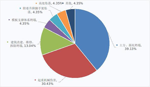 全國房屋市政工程生產(chǎn)安全較大及以上事故按照類型劃分,土方、基坑坍塌事故9起,占事故總數(shù)的39.13%;起重機(jī)械傷害事故7起,占總數(shù)的30.43%;建筑改建、維修、拆除坍塌事故3起,占總數(shù)的13.04%;模板支撐體系坍塌、附著升降腳手架墜落、高處墜落以及其他類型事故各1起、各占總數(shù)的4.35%(見圖6)。