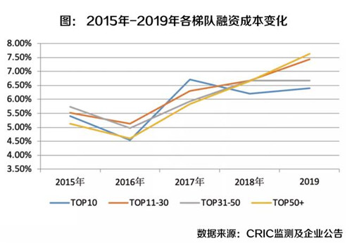 2019年CRIC監(jiān)測的80家房企來看,平均融資成本達7.47%,為近五年最高。值得注意的是銷售50強以后的房企融資成本上升速度非?,顯著高于行業(yè)平均,由此可以預見,業(yè)績銷售排名更低的小企業(yè)融資壓力更是巨大。