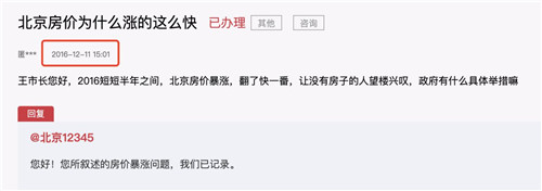 2016年底,一位北京市民在領(lǐng)導留言板上留言,抱怨半年之內(nèi)“房價暴漲,翻了快一番”。12345還給了回復,表示“已記錄”。