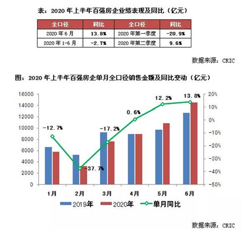 2020年6月,市場熱度持續(xù)、房企去化加速,TOP100房企單月實(shí)現(xiàn)全口徑銷售金額14517.2億元,環(huán)比增長33%。單月業(yè)績同比逐月回升,自4月轉(zhuǎn)正后進(jìn)一步提升至13.8%。