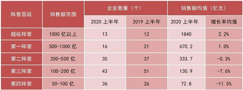 2020年上半年各陣營(yíng)房企銷(xiāo)售情況 數(shù)據(jù)來(lái)源:中指研究院