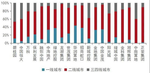 2020年上半年代表房企 各等級(jí)城市銷(xiāo)售占比情況 數(shù)據(jù)來(lái)源:中指研究院