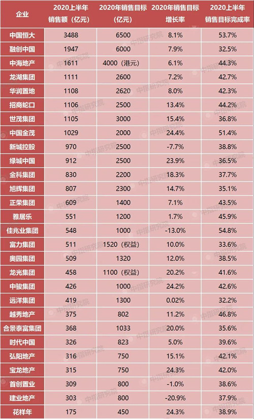 2020年上半年部分房企業(yè)績(jī)完成情況 數(shù)據(jù)來(lái)源:中指研究院