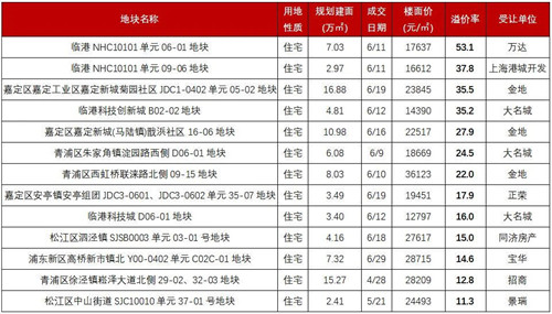 從溢價(jià)率來(lái)看,上半年,溢價(jià)率最高的地塊為閔行區(qū)浦錦街道蘆恒路北塊居住小區(qū)3-8地塊,溢價(jià)率164%,競(jìng)得人為上海閔行儲(chǔ)備糧管理總公司。商品住宅用地中,溢價(jià)率最高的為臨港NHC10101單元06-01地塊,溢價(jià)率為53.13%,競(jìng)得人為萬(wàn)達(dá)。