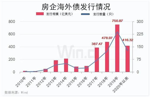 Wind數(shù)據(jù)顯示,截至7月21日,房企境外發(fā)債規(guī)模已經(jīng)達(dá)到416.32億美元(約合2910.45億元),已經(jīng)超過(guò)2017年全年規(guī)模,且接近2018年全年規(guī)模。