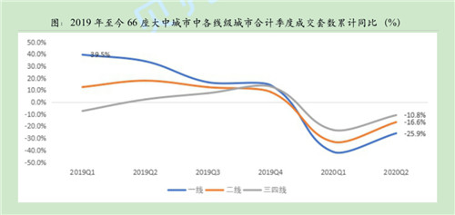 不過,報告指出,一二線城市新房市場雖然受疫情影響較大,但恢復(fù)速度也更快,在疫情穩(wěn)定的二季度,成交量環(huán)比收窄15-16個百分點,三四線城市則環(huán)比收窄12-13個百分點。