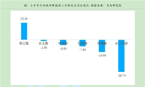 從區(qū)域上看,環(huán)深、環(huán)滬城市群復(fù)蘇強勁,上半年環(huán)深城市群重點城市總成交同比增加20%,其中主要是廣州市場修復(fù)強勁。環(huán)滬城市圈二手房的成交量,已經(jīng)基本上恢復(fù)到去年同期水平(同比微降1.6%)。