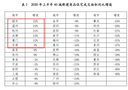 報(bào)告顯示,今年上半年,40城中只有韶關(guān)、溫州、杭州、成都、廈門和東莞這6個(gè)城市新建商品住宅成交量同比增長(zhǎng),其余均同比下降。