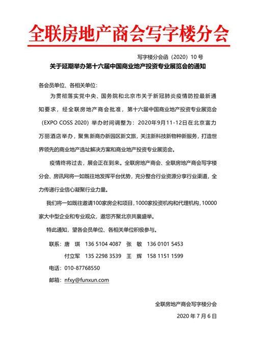 房訊網(wǎng)訊 為貫徹落實(shí)黨中央、國(guó)務(wù)院和北京市關(guān)于新冠肺炎疫情防控最新通知要求,確保參會(huì)安全和參會(huì)效果,經(jīng)全聯(lián)房地產(chǎn)商會(huì)批準(zhǔn),第十六屆中國(guó)商業(yè)地產(chǎn)投資專(zhuān)業(yè)展覽會(huì)(EXPO COSS 2020)舉辦時(shí)間調(diào)整為:2020年9月11-12日在北京富力萬(wàn)麗酒店舉辦。