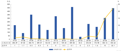 2020年前7月上海土地出讓金及溢價(jià)率走勢 數(shù)據(jù)來源:中指研究院