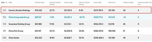 聚焦房地產(chǎn)行業(yè),共有5家企業(yè)上榜。其中,排名前三的房企為碧桂園控股有限公司、中國恒大公司和綠地控股集團有限公司,排名分別為第147名、152名和176名。另外兩家企業(yè)為中國保利集團和萬科企業(yè)股份有限公司,分別位列第191名和208名。