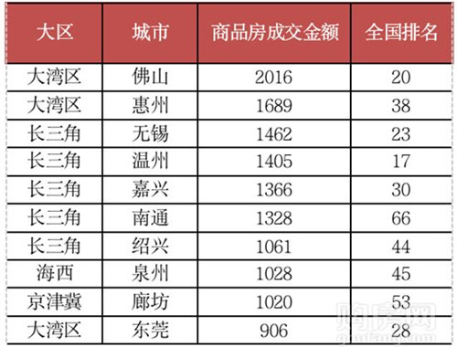 2018年商品房成交金額TOP10三四線城市排名情況(單位:億元)