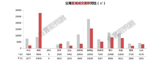 7月各區(qū)成交量對比半年度沖刺的6月普遍下降,降幅基本在3成以上;海珠區(qū)則逆勢上升,主要由越秀星匯海珠灣帶動,7月成交超過2.7萬㎡,來自項目近期預(yù)售的C1棟39層復式公寓,憑借海珠老城區(qū)地段、低門檻且南向望江的優(yōu)勢,貨量去化迅速,推出后短期內(nèi)即去化超過7成;萬科世博匯、金龍城等番禺區(qū)項目7月亦收獲較好成交量。