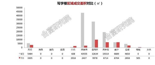 在成交區(qū)域分布方面,7月寫字樓成交主要集中在番禺、蘿崗及南沙區(qū),對比6月的半年度峰值,7月區(qū)域成交量基本呈下降態(tài)勢,番禺、蘿崗、黃埔等重點區(qū)域成交下滑6成以上。