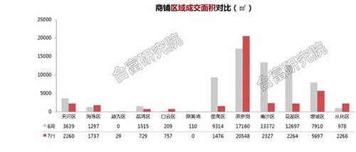 對比6月成交量,7月以環(huán)比下降為主基調(diào)。蘿崗由于廣州鋼鐵博匯持續(xù)大手交易的因素,成交持續(xù)兩個月保持堅挺。黃埔區(qū)西基島的舊改項目廣州鋼鐵博匯(一期)由廣州高新區(qū)投資集團有限公司整體認購,并分批次進行網(wǎng)簽;連續(xù)兩個月該項目商鋪均進行大手網(wǎng)簽,7月近2萬㎡的成交量顯著領(lǐng)先其余項目。剩余榜單項目主要為住宅社區(qū)配套商業(yè)。