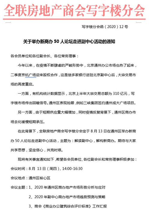 房訊網(wǎng)訊 今日(8月13日)下午,"新商辦50人論壇走進(jìn)副中心"活動(dòng)將在北京國(guó)際財(cái)富中心啟幕,以"解讀副中心,解構(gòu)新商辦"為主題,將邀約業(yè)內(nèi)專家、分會(huì)副會(huì)長(zhǎng)和常務(wù)理事等行業(yè)精英匯聚通州運(yùn)河商務(wù)區(qū),解析今年通州區(qū)域商辦行業(yè)趨勢(shì),解讀副中心商辦市場(chǎng)復(fù)蘇策略,推動(dòng)北京城市副中心商辦地產(chǎn)的復(fù)蘇。