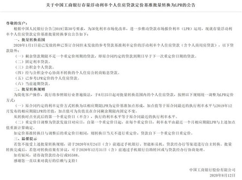 根據(jù)央行去年年底發(fā)布的公告,存量浮動利率個人貸款定價基準轉(zhuǎn)換工作2020年3月1日起正式啟動,原則上于2020年8月31日前完成。