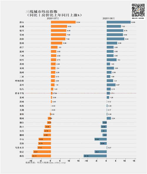 三線城市中,唐山、鹽城、徐州等漲幅居前。其中唐山環(huán)比上漲2.29%,鹽城環(huán)比上漲2.1%,徐州環(huán)比上漲1.43%。保定、貴陽(yáng)等城市跌幅居前。