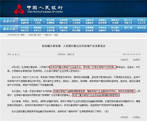 至8月23日上午,相關(guān)報(bào)道最終得到證實(shí)。8月20日,住房城鄉(xiāng)建設(shè)部、人民銀行在北京召開重點(diǎn)房地產(chǎn)企業(yè)座談會,研究進(jìn)一步落實(shí)房地產(chǎn)長效機(jī)制。銀保監(jiān)會、證監(jiān)會、外匯局、交易商協(xié)會等相關(guān)部門負(fù)責(zé)同志,以及部分房地產(chǎn)企業(yè)負(fù)責(zé)人參加會議。