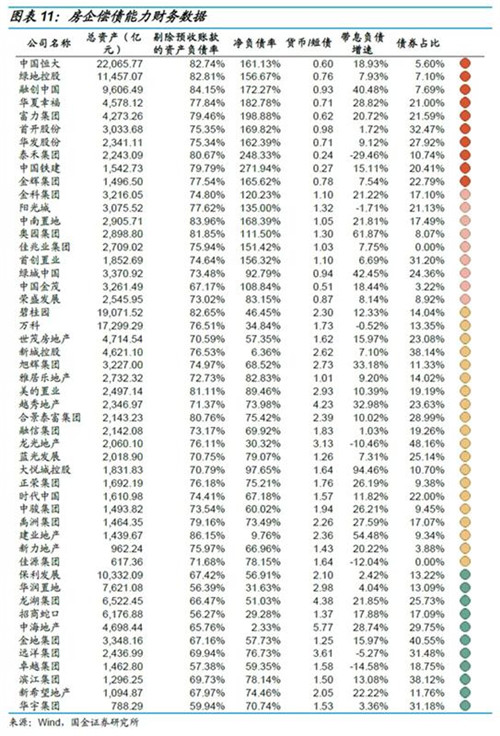 從企業(yè)端看,部分高負(fù)債、短期債務(wù)壓力大的房企,將承受更大的壓力。國金證券首席分析師周岳在近日的一份研報(bào)中指出,房企剔除預(yù)收賬款的資產(chǎn)負(fù)債率整體偏高,38家房企該比率超過70%,建業(yè)地產(chǎn)、融創(chuàng)中國、中南置地、綠地控股等10家房企剔除預(yù)收賬款的資產(chǎn)負(fù)債率超過80%。凈負(fù)債率指標(biāo)方面,超過半數(shù)房企在該比率上小于100%,泰禾集團(tuán)、富力集團(tuán)、華夏幸福、融創(chuàng)中國、首開股份、華發(fā)股份、中國鐵建、中南置地、奧園集團(tuán)、首創(chuàng)置業(yè)等16家房企凈負(fù)債率大于100%。