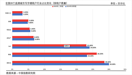 中指研究院發(fā)布的上半年寫字樓市場租戶報告顯示,2020年上半年主要租戶類型集中在服務業(yè)、TMT和零售行業(yè),三者在數(shù)量上基本占總體租戶數(shù)量的近八成;其次是金融業(yè)、制造業(yè)和房地產(chǎn)業(yè)。在疫情之下,線上經(jīng)濟活躍度有所提升,網(wǎng)上零售、直播電商等線上銷售的寫字樓租賃需求增長迅速。