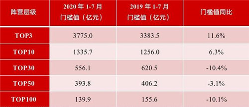 7月31日晚間,多家機(jī)構(gòu)發(fā)布百?gòu)?qiáng)房企1~7月銷售業(yè)績(jī)榜,房企銷售業(yè)績(jī)繼續(xù)修復(fù)的同時(shí)出現(xiàn)了陣營(yíng)分化,頭部企業(yè)修復(fù)更快、競(jìng)爭(zhēng)激烈。據(jù)中指院數(shù)據(jù),TOP3以及TOP10房企門檻值較去年同期分別上漲11.6個(gè)、6.3個(gè)百分點(diǎn),但TOP30、TOP50、TOP100房企門檻值較去年同期下降。千億房企陣營(yíng)較1~6月(13家)增加了5家,較去年同期增加3家。