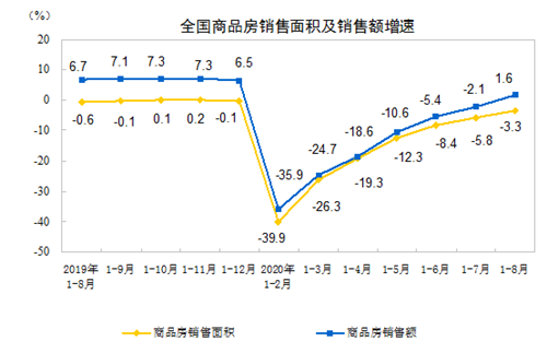 1—8月份,商品房銷售面積98486萬(wàn)平方米,同比下降3.3%,降幅比1—7月份收窄2.5個(gè)百分點(diǎn)。其中,住宅銷售面積下降2.5%,辦公樓銷售面積下降19.5%,商業(yè)營(yíng)業(yè)用房銷售面積下降17.0%。商品房銷售額96943億元,增長(zhǎng)1.6%,1—7月份為下降2.1%。其中,住宅銷售額增長(zhǎng)4.1%,辦公樓銷售額下降18.0%,商業(yè)營(yíng)業(yè)用房銷售額下降19.9%。