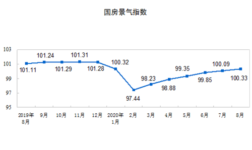 8月份,房地產(chǎn)開(kāi)發(fā)景氣指數(shù)(簡(jiǎn)稱“國(guó)房景氣指數(shù)”)為100.33,比7月份提高0.24點(diǎn)。