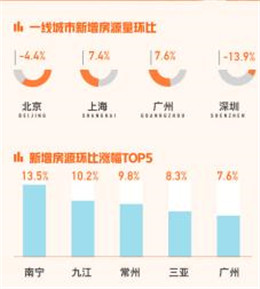 市場(chǎng)供應(yīng)方面,報(bào)告顯示全國(guó)新增掛牌房源量環(huán)比下跌4.8%。一線城市北京和深圳出現(xiàn)一定程度的環(huán)比下跌情況,其中深圳新增掛牌房源量環(huán)比下降最為明顯,為-13.9%;上海和廣州新增掛牌房源量環(huán)比上漲均超過(guò)7%。從全國(guó)范圍來(lái)看,南寧、九江、常州、三亞和廣東環(huán)比上漲形勢(shì)備受矚目,其中南寧以13.5%的環(huán)比漲幅排名最高。