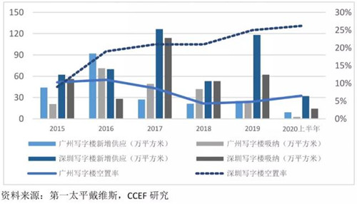 圖2 廣州、深圳甲級寫字樓供需情況