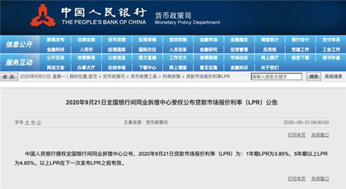 房訊網(wǎng)訊 9月21日,央行官網(wǎng)剛剛發(fā)布公告稱,中國人民銀行授權(quán)全國銀行間同業(yè)拆借中心公布,2020年9月21日貸款市場報(bào)價(jià)利率(LPR)為:1年期LPR為3.85%,5年期以上LPR為4.65%。以上LPR在下一次發(fā)布LPR之前有效。