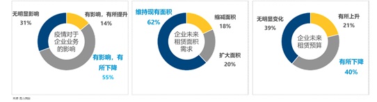 國有企業(yè):“穩(wěn)”字當頭。疫情對于國有企業(yè)的業(yè)務影響有限,業(yè)務提升或沒有影響的比例高達63%;同時租賃需求以維持現(xiàn)狀為主,86%選擇維持面積,并有半數(shù)企業(yè)預計維持預算。