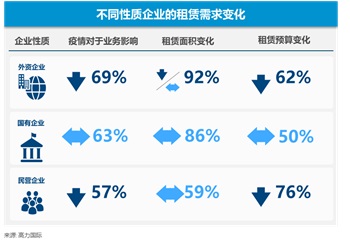 被訪企業(yè)中,國企依然“穩(wěn)”字當頭,外企普遍受沖擊較大,互聯(lián)網(wǎng)企業(yè)在民企中擴租意愿最強。當我們聚焦到企業(yè)性質(zhì)時,可以看到不同性質(zhì)的企業(yè)受到疫情影響程度有所不同,因此租賃需求和預算的變化也各有不同,其中: