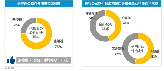 遠程辦公軟件成為辦公新趨勢,企業(yè)普遍認為該技術(shù)會一定程度降低未來辦公面積需求。在我們調(diào)查的企業(yè)中,遠程辦公軟件的使用率高達75%。同時,我們發(fā)現(xiàn)遠程辦公軟件的使用率在各性質(zhì)企業(yè)與各行業(yè)中并沒有顯著的差異。此外,企業(yè)對于遠程辦公軟件的使用效果也較為滿意,滿意度平均得分3.7分(5分制)?梢哉f,此次疫情使得遠程辦公軟件在各行各業(yè)中,得到了較為廣泛且有效的應用。那么遠程辦公軟件的應用,對于企業(yè)未來辦公面積的需求是否造成了影響?調(diào)查結(jié)果顯示企業(yè)認為遠程辦公軟件會減少辦公租賃需求的比例為46%。而當我們進一步去細分那些使用過遠程辦公軟件的企業(yè)時,我們發(fā)現(xiàn)這個比例會提高到53%。同時,我們發(fā)現(xiàn)對于遠程辦公軟件使用的滿意度,并不會降低企業(yè)在租賃面積上的需求。也就是說,當企業(yè)使用過遠程辦公軟件后,都會在一定程度上更加認同這樣的技術(shù)會降低其未來的辦公面積需求。因此,遠程辦公軟件的廣泛應用確實會在一定程度上改變了企業(yè)在辦公面積上的需求。