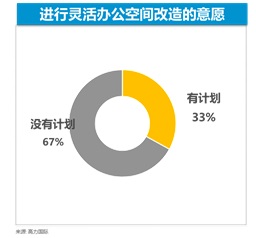 靈活辦公空間設計理念認知度有待進一步提高。在2019年的7月高力國際舉辦的“2019靈活辦公未來趨勢研討會”上,我們就曾指出伴隨著商務行為而產(chǎn)生的辦公場所,經(jīng)歷了從格子間向開放式空間,從開放式空間向靈活辦公的模式演變。在此次調(diào)查中,我們看到企業(yè)當前對于靈活辦公空間改造的認知度并不高,進而對于靈活辦公空間改造的意愿并不強,有計劃改造的僅占33%。同時我們發(fā)現(xiàn),相較于國企和民企,外資企業(yè)進行靈活辦公空間改造嘗試的意愿也更強為54%,而國企嘗試意愿相對較低僅為14%。在細分行業(yè)上,專業(yè)服務類企業(yè)更愿意進行這樣的嘗試,有一半的企業(yè)有意愿嘗試。