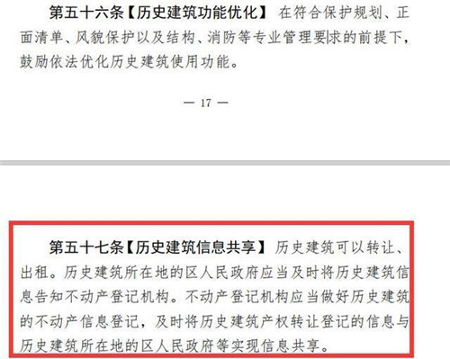 征求意見稿提出,在符合保護(hù)規(guī)劃、正面清單、風(fēng)貌保護(hù)以及結(jié)構(gòu)、消防等專業(yè)管理要求的前提下,鼓勵(lì)依法優(yōu)化歷史建筑使用功能。歷史建筑可以轉(zhuǎn)讓、出租。歷史建筑所在地的區(qū)人民政府應(yīng)當(dāng)及時(shí)將歷史建筑信息告知不動(dòng)產(chǎn)登記機(jī)構(gòu)。不動(dòng)產(chǎn)登記機(jī)構(gòu)應(yīng)當(dāng)做好歷史建筑的不動(dòng)產(chǎn)信息登記,及時(shí)將歷史建筑產(chǎn)權(quán)轉(zhuǎn)讓登記的信息與歷史建筑所在地的區(qū)人民政府等實(shí)現(xiàn)信息共享。