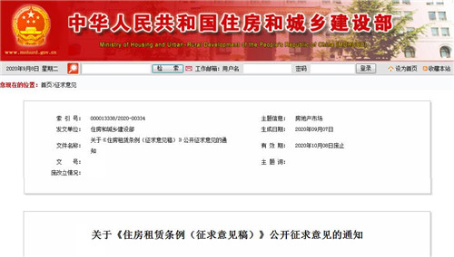 房訊網(wǎng)訊 9月7日,住建部關(guān)于《住房租賃條例(征求意見稿)》公開征求意見的通知,為了提高住房租賃立法質(zhì)量,根據(jù)工作安排,將《住房租賃條例(征求意見稿)》向社會公開征求意見。意見反饋截止日期為2020年10月8日!稐l例》包括總則、出租與承租、租賃企業(yè)、經(jīng)紀活動、扶持措施、服務與監(jiān)督、法律責任和附則等8章。