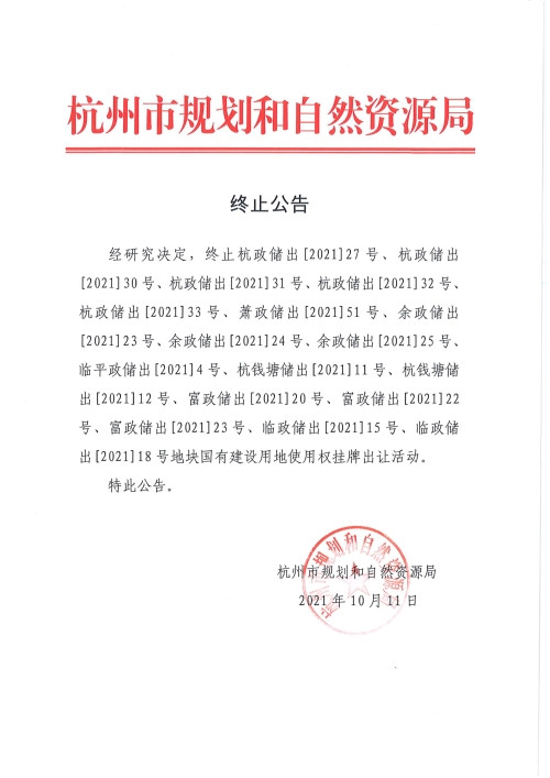 《公告》稱,經(jīng)研究決定,終止杭政儲出[2021]27號、杭政儲出[2021]30號、杭政儲出[2021]31號、杭政儲出[2021]32號、杭政儲出[2021]33號、蕭政儲出[2021]51號、余政儲出[2021]23號、余政儲出[2021]24號、余政儲出[2021]25號、臨平政儲出[2021]4號、杭錢塘儲出[2021]11號、杭錢塘儲出[2021]12號、富政儲出[2021]20號、富政儲出[2021]22號、富政儲出[2021]23號、臨政儲出[2021]15號、臨政儲出[2021]18號地塊國有建設用地使用權掛牌出讓活動。