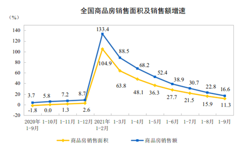 房訊網(wǎng)訊 據(jù)國家統(tǒng)計(jì)局?jǐn)?shù)據(jù),1-9月份,全國商品房銷售面積130332萬平方米,同比增長11.3%;比2019年1—9月份增長9.4%,兩年平均增長4.6%。其中,住宅銷售面積增長11.4%,辦公樓銷售面積增長3.1%,商業(yè)營業(yè)用房銷售面積增長0.7%。