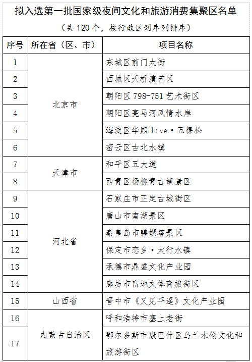 房訊網(wǎng)訊 10月19日,文旅部發(fā)布第一批國家級夜間文化和旅游消費集聚區(qū)名單的公示,經(jīng)地方申報、省廳推薦、合規(guī)性審查、專家評審、輿情風控、實地考察等方式,擬確定北京市東城區(qū)前門大街等120個項目為第一批國家級夜間文化和旅游消費集聚區(qū)。公示期為5個工作日(自2021年10月19日至25日)。